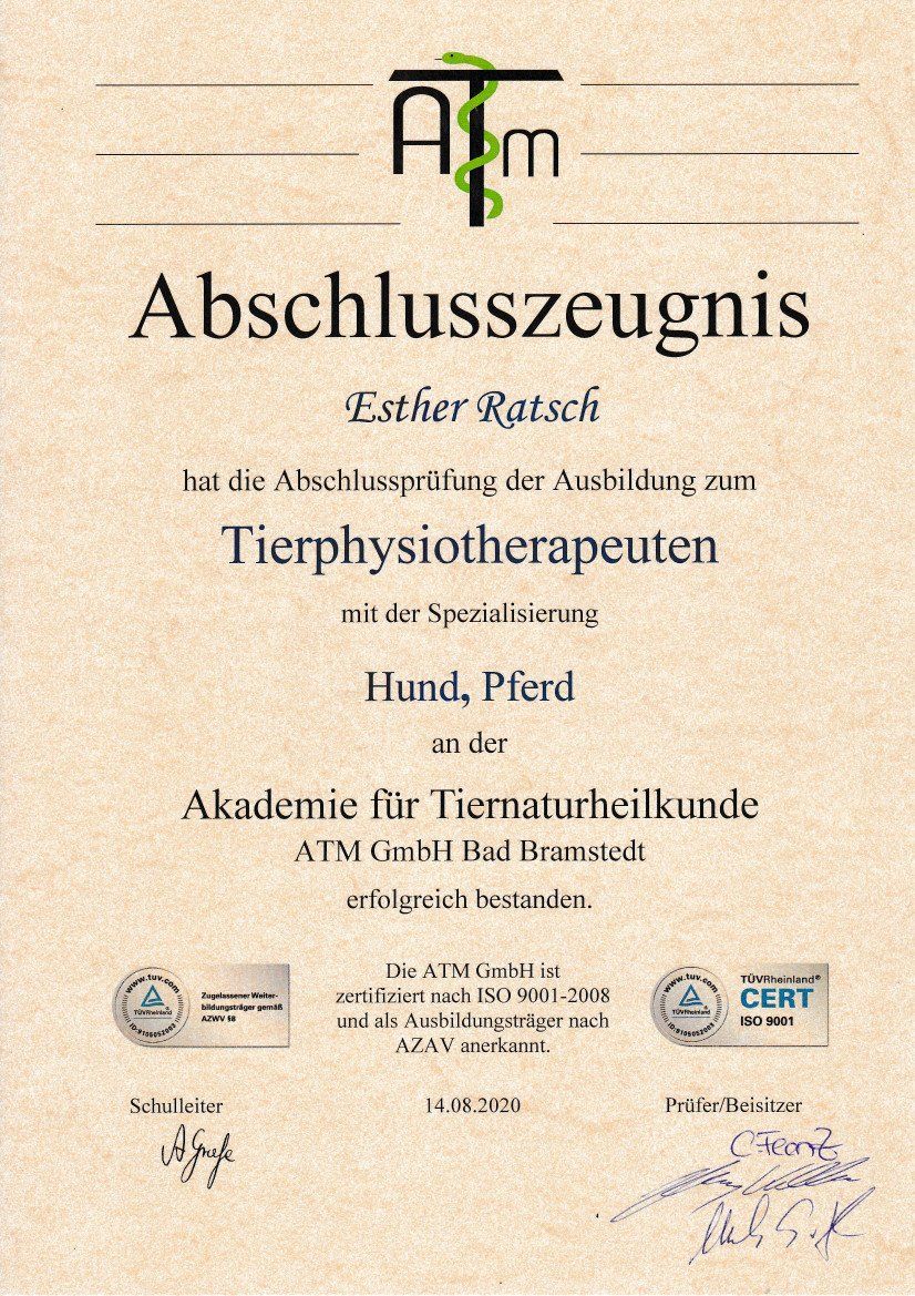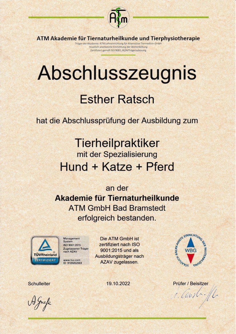 Um dies bestmöglich unterstützen zu können, habe ich 2020 die Ausbildung zur Tierphysiotherapeutin und 2022 die Ausbildung zur Tierheilpraktikerin an der ATM (Akademie für Tiernaturheilkunde) abgeschlossen.